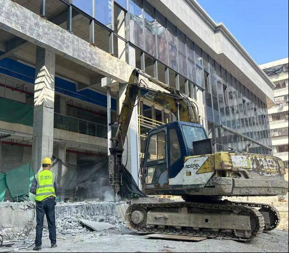 在“金葉匯”商業(yè)綜合體項目現(xiàn)場,玻璃幕墻安裝已封頂,工人正在對塔吊承臺進行破除,后續(xù)將做好公共區(qū)域裝飾裝修、機電安裝等收尾工作,沖刺全面竣工驗收節(jié)點。
